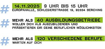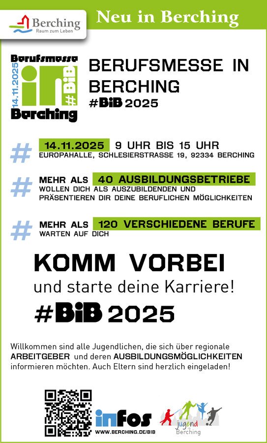 Die erste Ausgabe der Berufsmesse in Berching - #BiB - findet am 14. November 2025 in der Europahalle statt. Von 9 Uhr bis 15 Uhr präsentieren sich lokale und regionale Arbeitgeber mit ihren Ausbildungsmöglichkeiten.