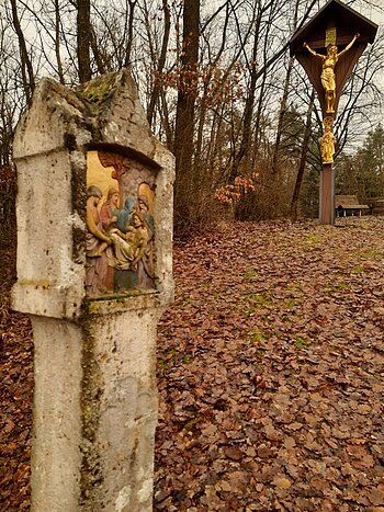 Folgt man der Plankstraße auf der Westseite des Main-Donau-Kanals hinauf zum Elysium, geht es in Richtung Kreuzweg weiter zu den um 1884 errichteten 14 Steinsäulen die das Leiden Christi spiegeln. Der Weg führt hinauf zur Jurahöhe mit dem Kreuz auf dem Kalvarienberg und dem wunderbaren Ausblick auf das Tal der Sulz und den Main-Donau-Kanal. Auch ein bequemes Waldsofa lädt zum Wolkenkino ein.