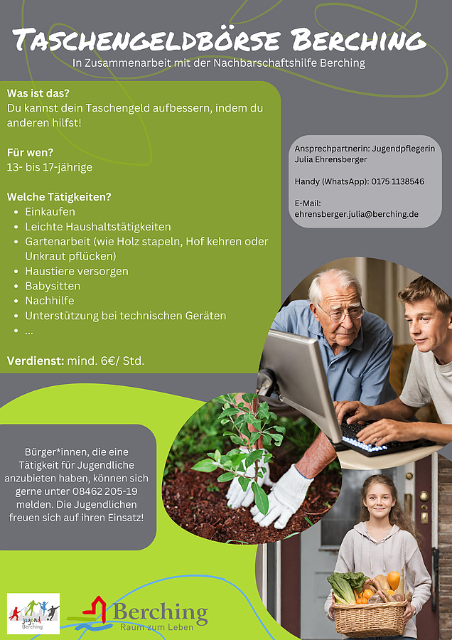 Für viele weitere Themen wie Fahrdienste, Behördengänge oder Kontakt zu anderen Hilfsorganisationen steht die Nachbarschaftshilfe der Stadt Berching zur Verfügung.